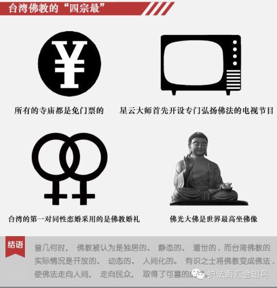 台灣道場最突出的成就是它的傳教形式。四大佛教道場的成功,其實並不在 “大”,重點在於其創新與特色。佛光山由星雲法師開山,佛光山的突出成就是它的傳教形式——200多個道場,遍及五大洲,可以說第一次將漢傳佛教世界化。